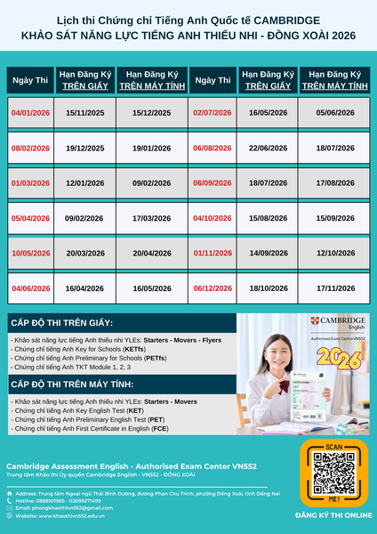 LỊCH THI CHỨNG CHỈ TIẾNG ANH QUỐC TẾ CAMBRIDGE VÀ IELTS NĂM 2026