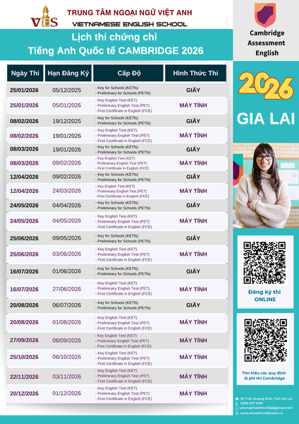 VES là đối tác chính thức của Cambridge tại Gia Lai nên các bạn và học viên của VES có thể đăng kí tại các cơ sở của VES nhé.